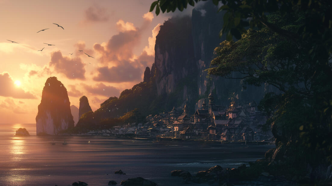 Fang’s Bay: Southern coastal port and pirate haven, bustling with trade ships and outlaw activity.